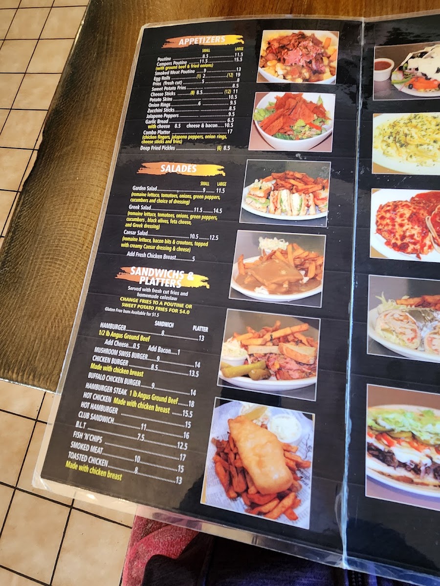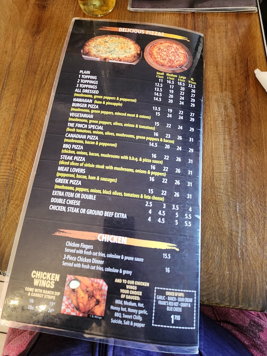 The Finch Restaurant offers a diverse and satisfying menu with options to please a variety of tastes. For appetizers, diners can indulge in Campers Poutine and Smoked Meat Poutine, both perfect for those craving rich, hearty flavors. For lighter bites, Egg Rolls and Fries (including Sweet Potato Fries) provide a tasty and crispy start to the meal. The salad selection features refreshing options like the Garden Salad and the classic Caesar Salad. Sandwich lovers will appreciate a wide range of choices, such as the Chicken Burger, Buffalo Chicken Burger, and the hearty Mushroom Swiss Burger. Those craving something more substantial can enjoy the Hamburger Steak or opt for a delicious Hamburger. The pizza menu is equally tempting, offering classics like the Plain pizza, along with more exciting choices such as the All Dressed, Burger Pizza, and Canadian Pizza. For chicken lovers, the restaurant offers crispy Chicken Fingers and a satisfying 3-Piece Chicken Dinner. Each dish provides great value, making The Finch Restaurant a go-to spot for satisfying meals that cater to a wide range of tastes.